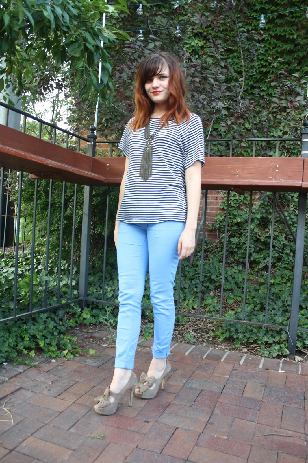 I seem to have fallen a bit behind on posting...this outfit is from at least a couple weeks ago! Though not completely current, it's an example of one of my favorite recipes for style: bright skinnies, a classic tee, a pair of hot heels and a couple of bold accessories! Easy peasy and appropriate for a variety of occasions. In my case, work at my (admittedly casual) office, followed by happy hour. Cheers!